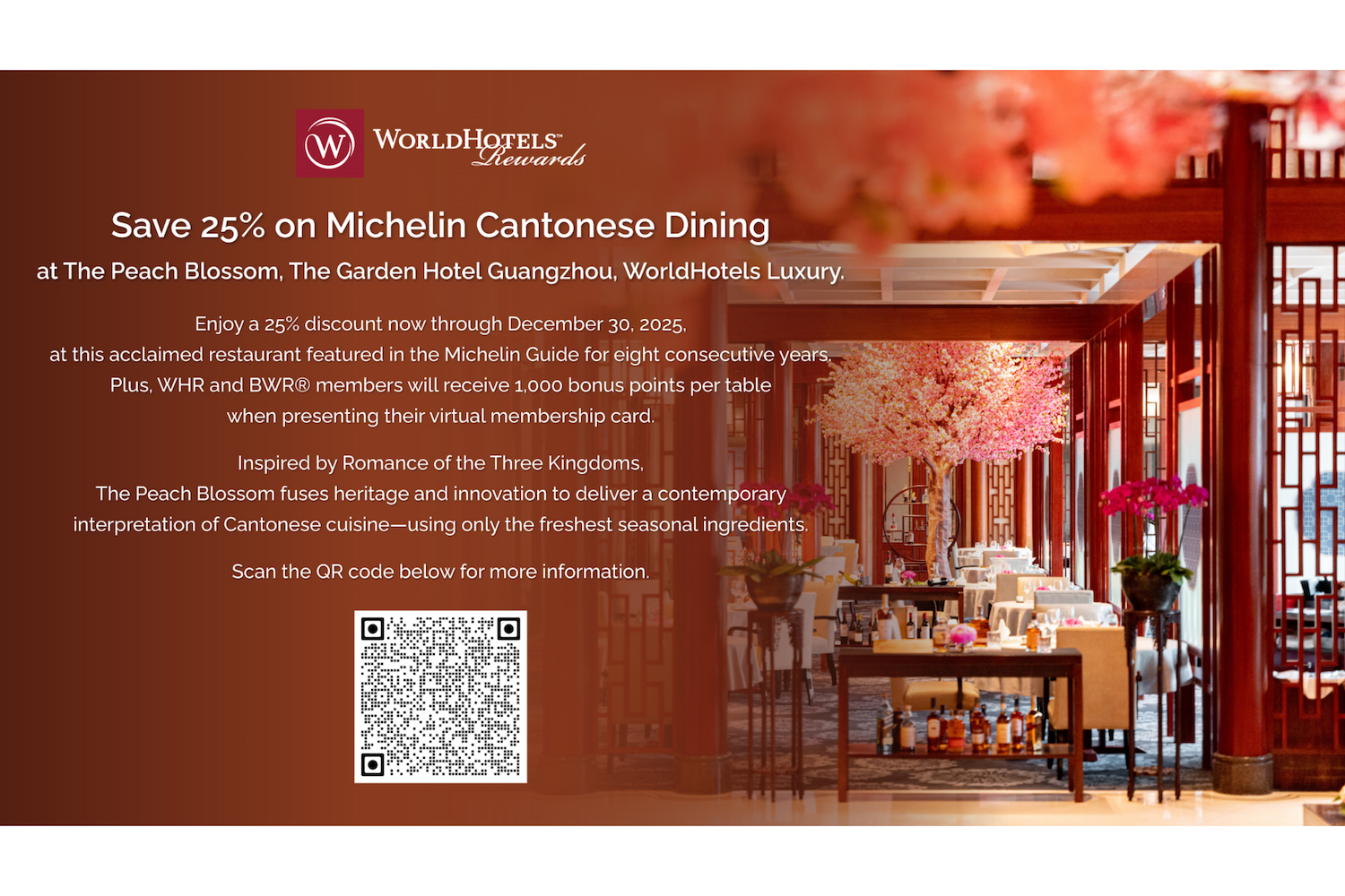 Save 25% on Michelin Cantonese Dining at The Peach Blossom,The Garden Hotel Guangzhou, WorldHotels Luxury.